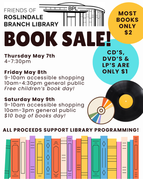 Accessible shopping 9-10 AM on Friday and Saturday. Free children’s book to all shoppers Grocery bag of books for $10.00 on Saturday. We are selling Books ($2), DVDs($1), CDs ($1), Folk Music LPs($1), Puzzles and games ($3) Buy 5 media items and get 1 free! All proceeds from the sale will go towards programming and other initiatives at the Roslindale Branch!